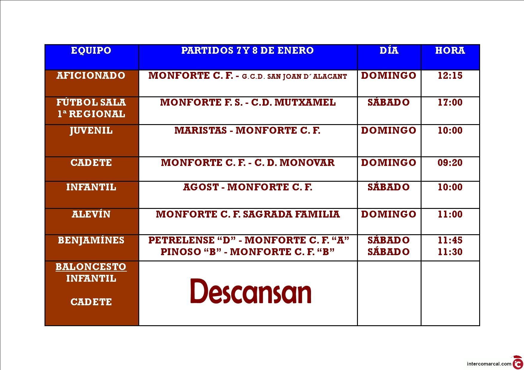HORARIOS DE EQUIPOS FEDERADOS DE MONFORTE 7 Y 8 DE ENERO