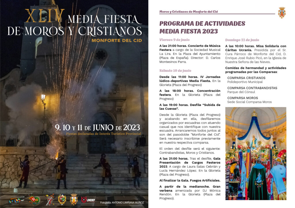 Monforte del Cid, 8 de junio de 2023. El fin de semana del 9 al 11 de junio, Monforte del Cid celebrará la Media fiesta. El primer acto a destacar será el viernes a las 21:00 h, con el concierto de música festera a cargo de la S.M La Lira en la Plaza de España y dirigidos por D. Carlos Montesinos Parra.