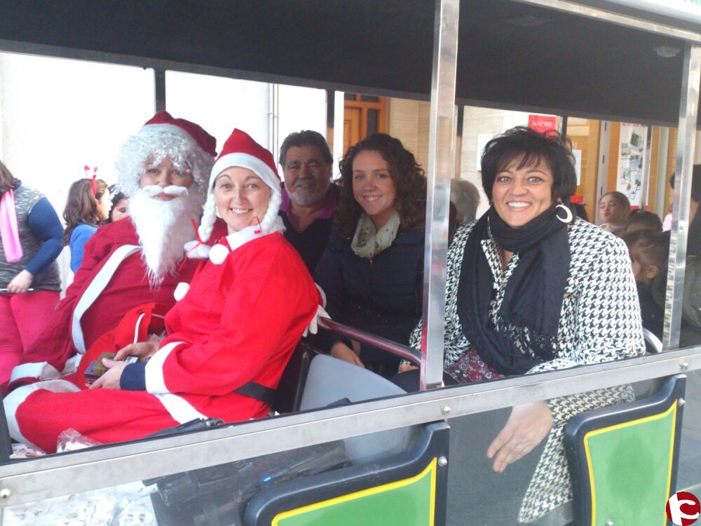 La alcaldesa de Monforte, Antonia Cervera acompañada por la edil de Comercio, Beatriz Llopis y junto al presidente de la Asociación de Comerciantes, Pepe Pomares han subido hoy en un tren que ha hecho diversos recorridos por las calles de la población y que ha ido llevando caramelos a los comercios adheridos a la Asociaicón de Comerciantes de Monforte del Cid.
