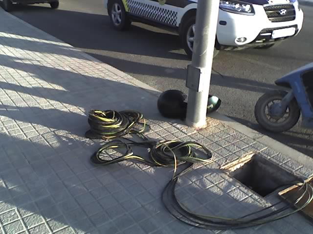 Los agentes observaron al acercarse como uno de ellos depositaba en el interior de una arqueta de alumbrado público un rollo de cable. Una vez identificados los individuos los agentes descubrieron que junto a las farolas más próximas a ellos habían unas tijeras de podar y restos del plástico que envuelve el cableado. La Policía Local comprueba la existencia de 450 metros de cable repartidos en las diferentes arquetas próximas al lugar de donde estaban, estando dispuestas para sustraerlas.