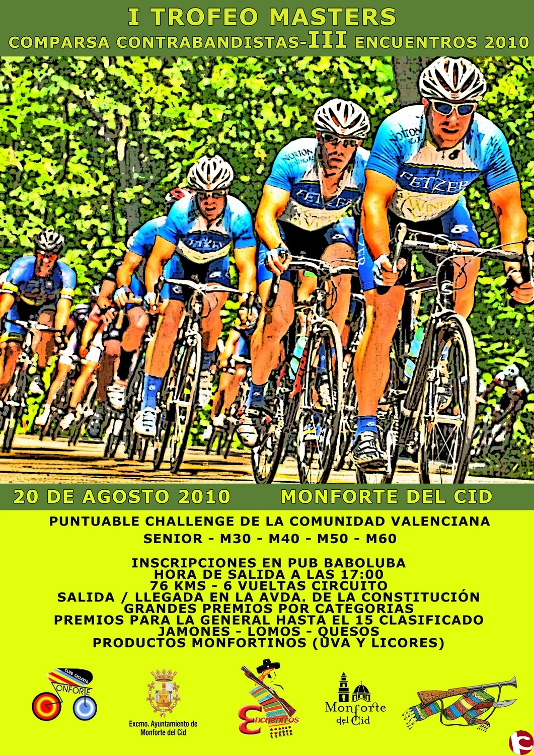 El próximo viernes 20 de agosto el municipio de Monforte del Cid acoge el I trofeo Masters- Comparsa Contrabandistas de ciclismo y que es puntuable en la Challenge de la Comunidad Valenciana en categorías de Senior, M30, M40, M50 y M60.