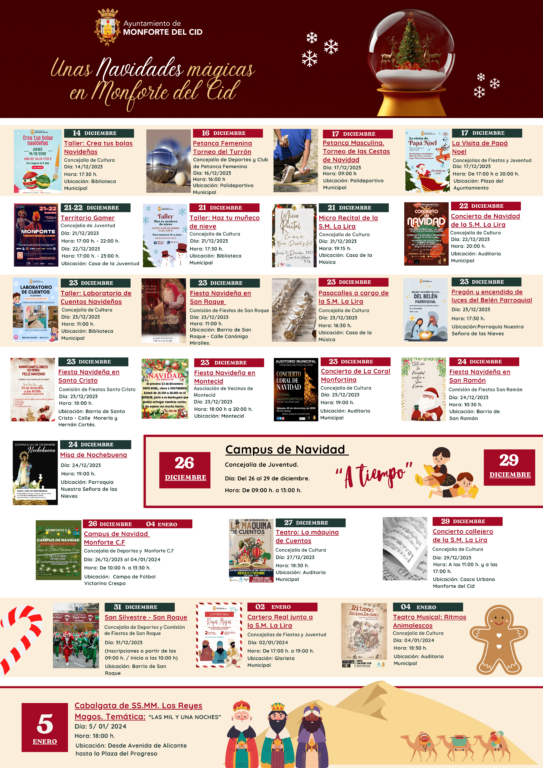 Esta Agenda Navideña está diseñada para que cada vecino y vecina, mayor, joven o pequeño/a de Monforte del Cid, e incluso visitante que desee unirse, participe activamente en cada uno de nuestros eventos.