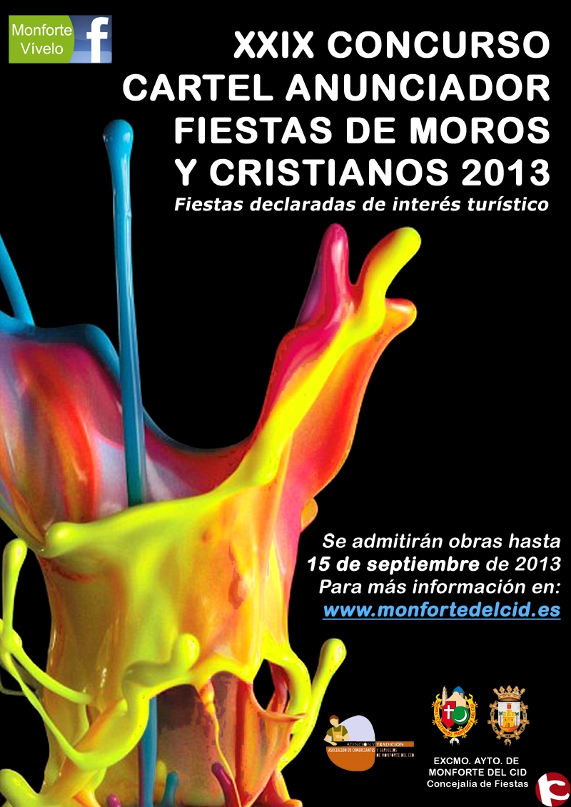 En relación al vigésimo noveno concurso del cartel anunciador de las Fiestas de Moros y Cristianos de Monforte del Cid, podrán participar todas las personas que aporten temas de propia creación que versen sobre las fiestas de Moros y Cristianos y que incluyan el siguiente lema: “Fiestas de Moros y Cristianos. Monforte del Cid del 5 al 9 de diciembre de 2013”. La composición del cartel adoptará la forma vertical y su formato será de 50x 70 cms., igualmente en el dorso se escribirá un lema. Habrá un premio de 300 euros para el artista ganador y un accesit especial para un artista local de 200 euros que serán otorgados por la Asociación de Comerciantes, con la obligación de que el importe total tendrá que ir destinado a compras en el comercio local.