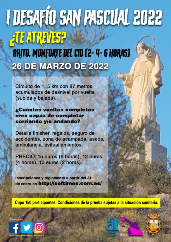 La concejalía de deportes del Ayuntamiento de Monforte del Cid organiza el sábado 26 de marzo el primer “Desafío San Pascual”. Se trata de una prueba deportiva en la que el participante elige entre un tiempo de 2, 4 o 6 horas para realizar el mayor número de veces posible la subida y bajada de la cueva de San Pascual por el tramo de vehículos. El recorrido se podrá realizar corriendo, andando o combinando el correr con andar, se podrá descansar tantas veces se requiera.
