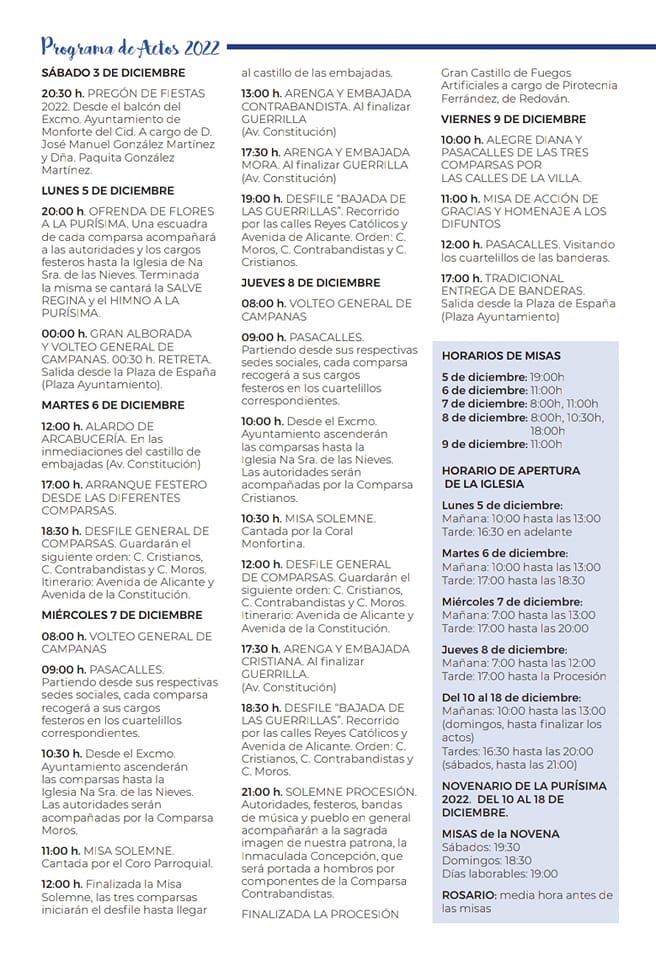 Las Fiestas de Moros y Cristianos de Monforte del Cid se inician con la salida del tambor los cuatro domingos previos al 5 de diciembre, día en el que se inician los festejos con la denominada Alborada. Fiestas Patronales y de Moros y Cristianos en honor a la Purísima. Sus orígenes se remontan a 1881, aunque no se ha celebrado todos los años desde entonces por razones económicas o de estabilidad política. Uno de los actos cumbre en la celebración de los Moros y Cristianos de Monforte del Cid es la Embajada que cada comparsa declama e interpreta con singular talento.