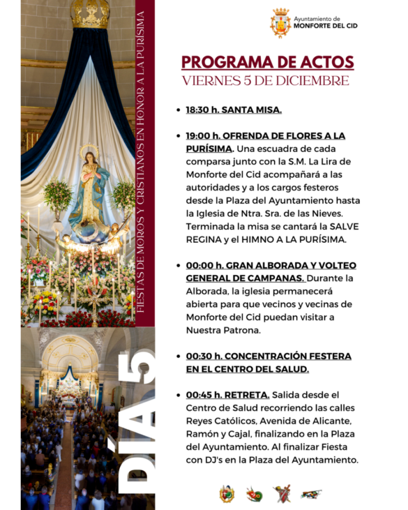 Aunque las fiestas oficiales se celebran del 5 al 9 de diciembre, la localidad dará su primer gran paso festero el sábado 29 de noviembre con el tradicional Pregón de Fiestas 2025.