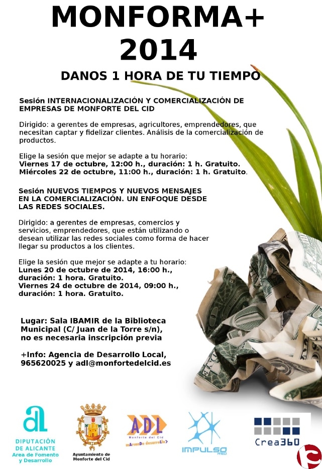 Estas sesiones que llevan por nombre Monforte+ consistirán por una parte en “Internacionalización y comercialización de empresas de Monforte del Cid”, dirigido a a gerentes de empresas, agricultores, emprendedores que necesitan captar y fidelizar clientes. La sesión de una hora de duración se impartirá dos días, el viernes 17 de octubre a las 12 horas y el miércoles 22 de octubre a las 11 horas. Por otro lado, el Consistorio ha organizado también una sesión sobre “Nuevos tiempos y nuevos mensajes en la comercialización. Un enfoque desde las Redes Sociales”. Este va dirigido a gerentes, comercios y servicios, emprendedores que están utilizando o desean utilizar las redes sociales como forma de hacer llegar sus productos a los clientes. La sesión también de una hora de duración será el lunes 20 de octubre a las 16 horas y el viernes 24 de octubre a las 9 horas. Todas las sesiones tendrán lugar en la Sala Ibamir de la Biblioteca Municipal.