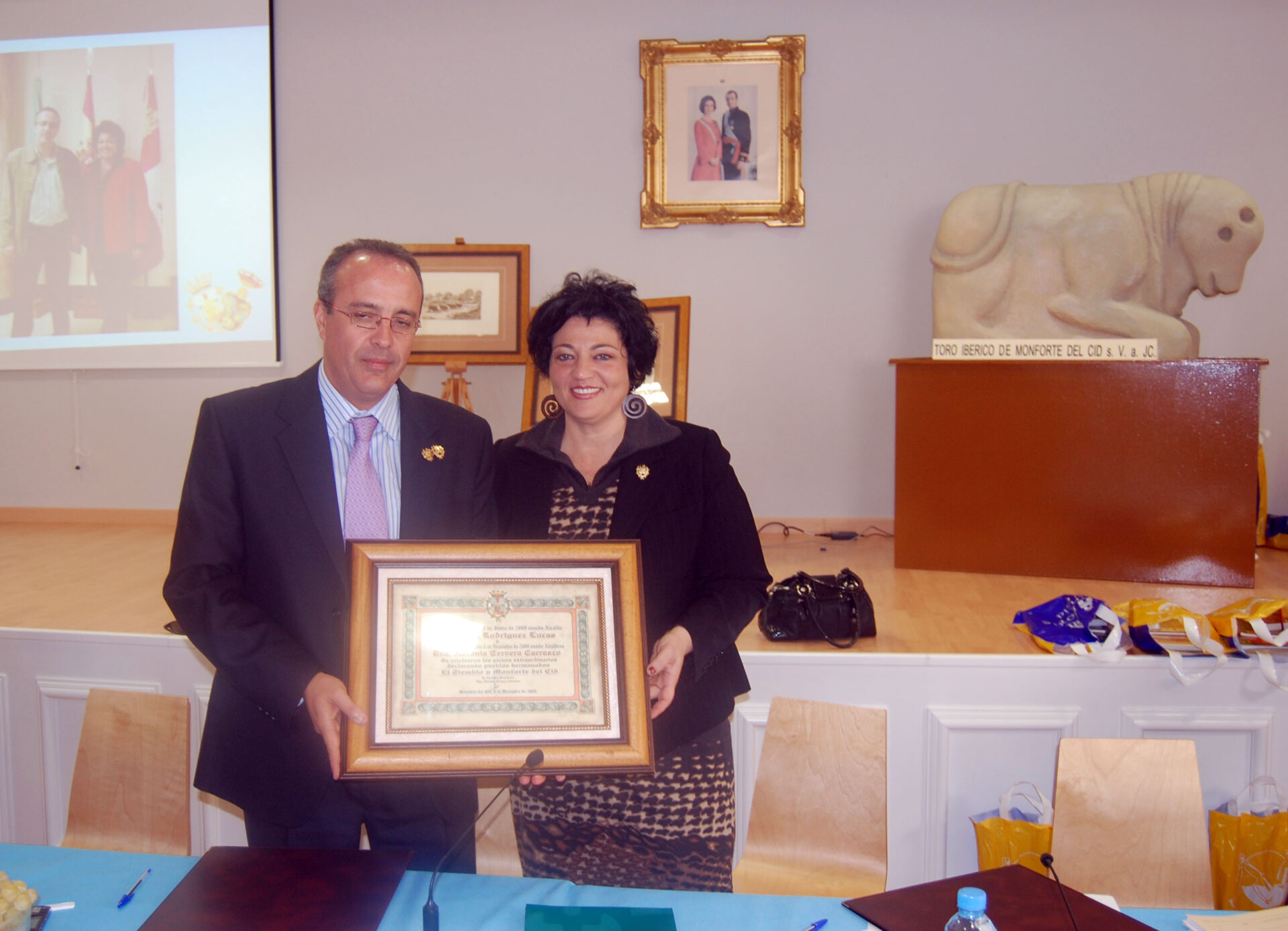 En sesión de Pleno Extraordinario celebrado el día 6 de diciembre en la Sala Ibamir de la Biblioteca de Monforte, la alcaldesa de la población Antonia Cervera ha firmado junto al alcalde de El Tiemblo (Ávila), Rubén Rodríguez el acta que sella oficialmente el hermanamiento entre ambas poblaciones conocidas por sus Toros Íberos en el caso de Monforte y por los Toros de Guisando en el del municipio abulense.