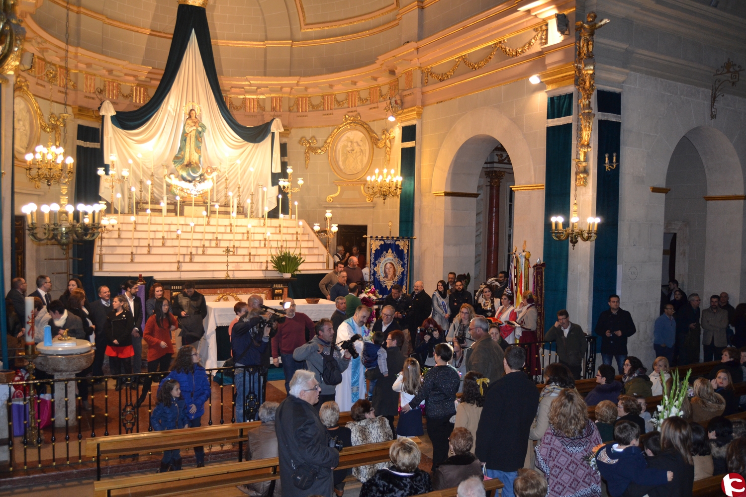 Desde las 20:00 horas, una escuadra de cada comparsa acompañó a las autoridades y los cargos festeros hasta la Iglesia de Ntra. Sra. de las Nieves. Terminada la misma se cantó la Salve Regina y el Himno a la Purísima. Posteriormente, el Pregón desde el balcón del Ayuntamiento a cargo de D. Eleuterio Romero Miralles.