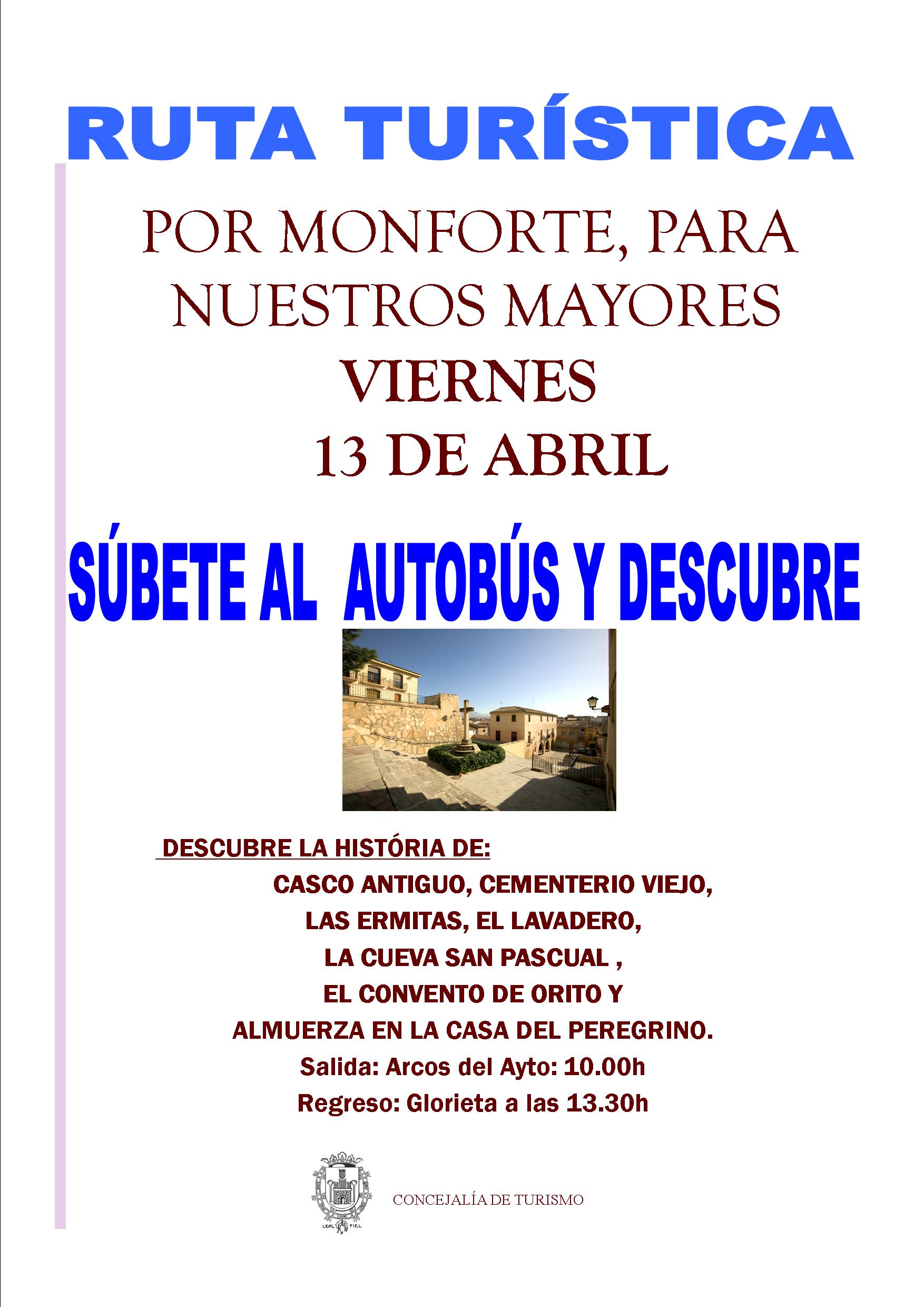 El próximo viernes 13 de abril a las 10.00 los mayores del pueblo tienen una cita en el Ayuntamiento, desde donde saldrán para iniciar una ruta turística a través de los lugares más emblemáticos de Monforte del Cid y Orito. El recorrido contará con un guía que irá explicando a los participantes todos los detalles más curiosos, anecdóticos y atractivos de la localidad, el patrimonio, la riqueza cultural, el entorno natural