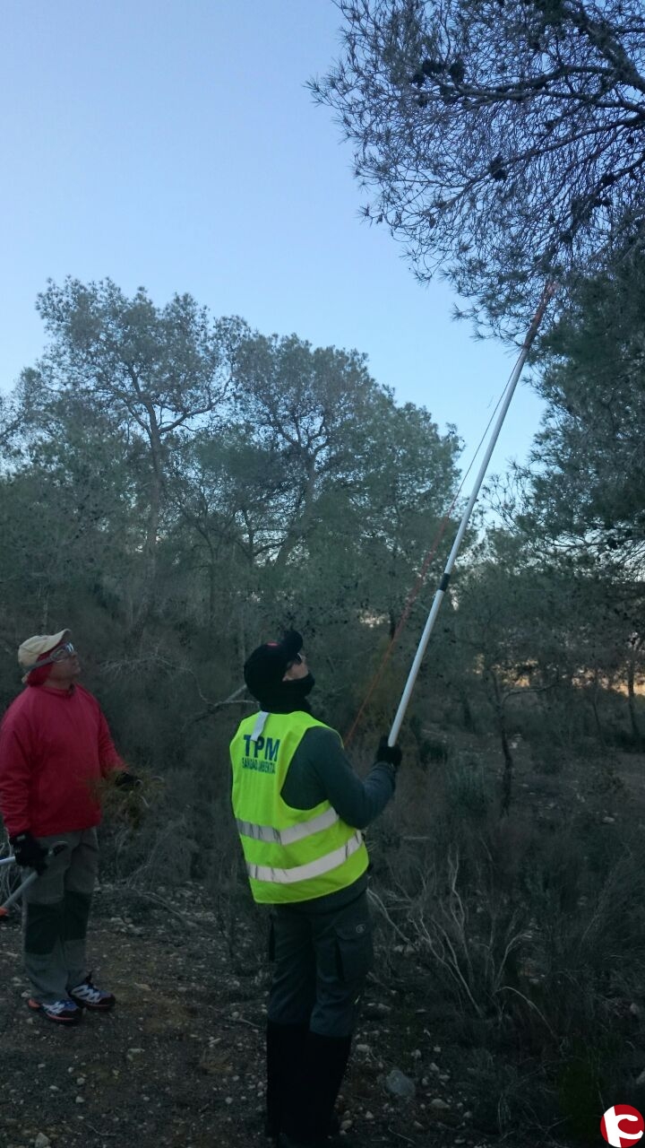 Desde hace una semana el Ayuntamiento de Monforte del Cid está realizando trabajos de retirada de bolsas de procesionaria del pino y tratamientos contra el xilófago en el camping de Orito y en el tramo de la subida a la cueva de San Pascual.