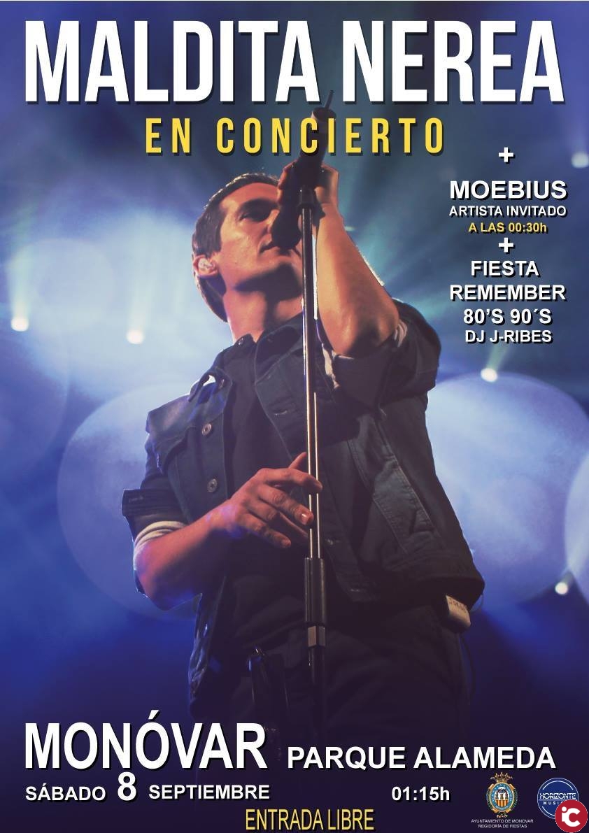El ayuntamiento de Monóvar, junto a la productora Horizonte Musical, han decidido ampliar la oferta musical para la noche del 8 de septiembre, día grande de las fiestas patronales. Así, a la actuación prevista de Maldita Nerea en el parque de La Alameda, prevista para alrededor de la 1 de la madrugada y con entrada libre, se suma la actuación de Moebius como artista invitado, a las 0030 de la noche, y una fiesta remember posterior, al finalizar el concierto, de la mano del DJ J-Ribes, quien centrará su actuación en música de los años 80 y 90.
