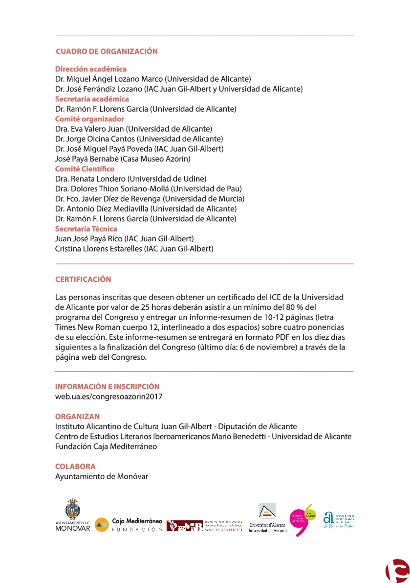 Este encuentro organizado por el Instituto Gil-Albert, la UA y la Fundación Caja Mediterráneo, en colaboración con la Diputación y el Ayuntamiento de Monóvar reunirá a una veintena de expertos nacionales y extranjeros a lo largo de catorce ponencias y coloquios, una exposición, un recital con sus textos, la proyección del documental Azorín. La imagen y la palabra y el homenaje en su panteón.