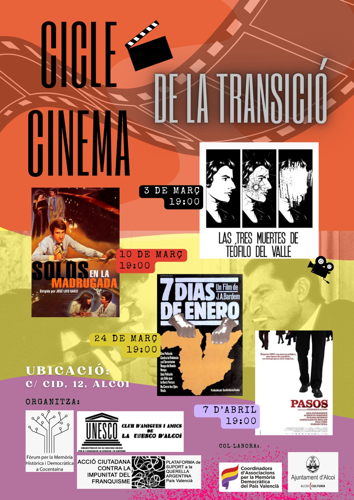 3 de març: Projecció de la pel·lícula Las tres muertes de Teófilo del Valle, una obra que enceta el Cicle de Cinema sobre la Transició en la qual estarà estaran presents el seu director, Manuel de Juan, i el script consultant, Michael Meert. Aquesta iniciativa es realitza junt amb el Club d’Amigues i Amics de la Unesco d’Alcoi. La projecció serà a les 19 hores en la seu del carrer Cid, 12, a Alcoi.
