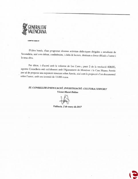 El acuerdo de Les Corts comprometía al Consell de la Generalitat a colaborar con diversas instituciones en el aniversario de los cincuenta años de la muerte del escritor monovero, así como tenía como acuerdo principal en forma de homenaje el declarar en toda la Comunitat Valenciana el año 2017, como Año Azorín.