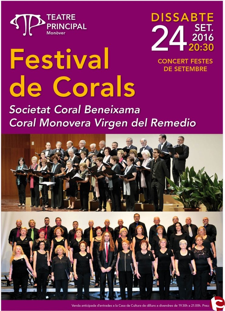 El sábado 24 de septiembre a las 20:30 horas, el Teatro Principal acogió el FESTIVAL DE CORALES con la participación de la Societat Coral de Beneixama y la Coral Monovera Virgen del Remedio. Este concierto se realiza con motivo de las Fiestas de Septiembre de Monovar.