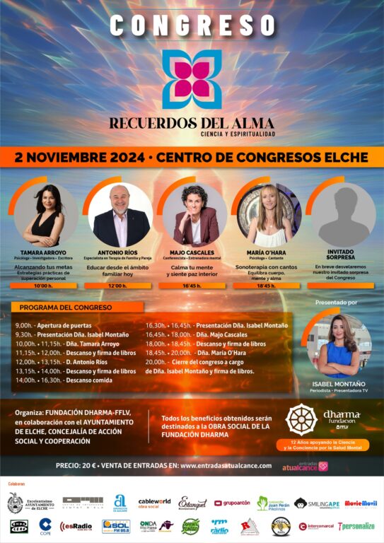 El próximo 2 de Noviembre del 2024 en el AUDITORIO DEL CENTRO DE CONGRESOS DE ELCHE, realizaremos el Congreso Solidario “RECUERDOS DEL ALMA” ciencia y espiritualidad.