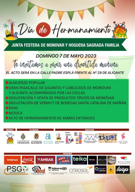 d’Alacant, i els assistents podran gaudir d’un esmorzar popular, un gran passacarrers dels Nanos i Gegants de Monòver i d’Alacant, acompanyats per la Colla El Xirivell. A continuació, s’ha previst la degustació i venda de productes típics monovers, així com el tast del vermut de Bodegas Santa Catalina del Mañán. També hi haurà rifes, música i un acte de germanor entre ambdues entitats.