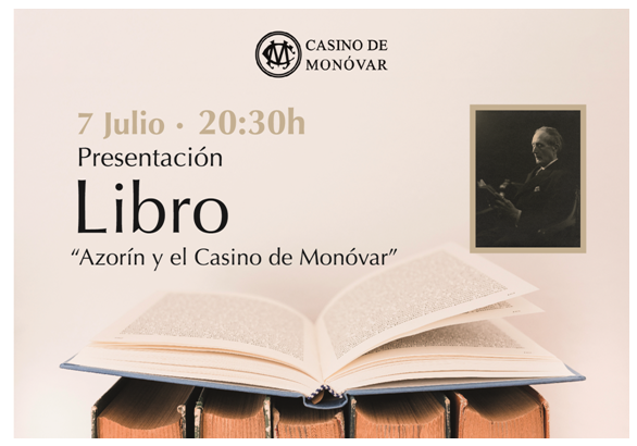 El próximo viernes 7 de julio, a la 20:30h en el Salón Montoro, se llevara a cabo la presentación del libro titulado: “Azorín y el Casino de Monóvar”, en el que los autores; Pepe Corbí y Paqui Limorti, han colaborado con el Casino en este NUEVO TRABAJO INDEDITO, entresacando las publicaciones y los pasajes más relevantes en los que Azorín habla o nombra al Casino.