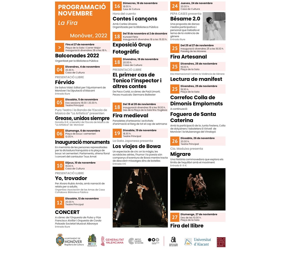 Monòver, dimecres, 2 de novembre de 2022.- La Regidoria de Cultura de l’Ajuntament de Monòver, ha previst, un any més, una àmplia i variada programació cultural al voltant de la celebració de la tradicional Fira de Santa Caterina.