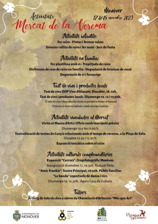 En l’organització d’aquesta activitat s’ha comptat amb molt diversos productors. S’hi trobaran les paradetes tradicionals, tasts de vins, tallers… tot per tal d’aconseguir una fira molt més autòctona i arrelada a Monòver.
