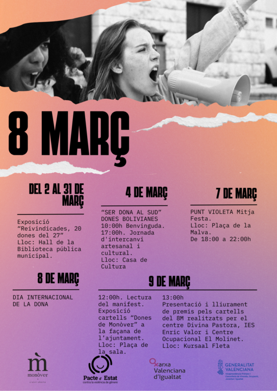 L’Ajuntament de Monòver ha organitzat una àmplia programació amb motiu del 8 de Març, Dia Internacional de la Dona, que es desenvoluparà del 2 al 9 de març, amb activitats destinades a fomentar la sensibilització, la convivència i la participació ciutadana.