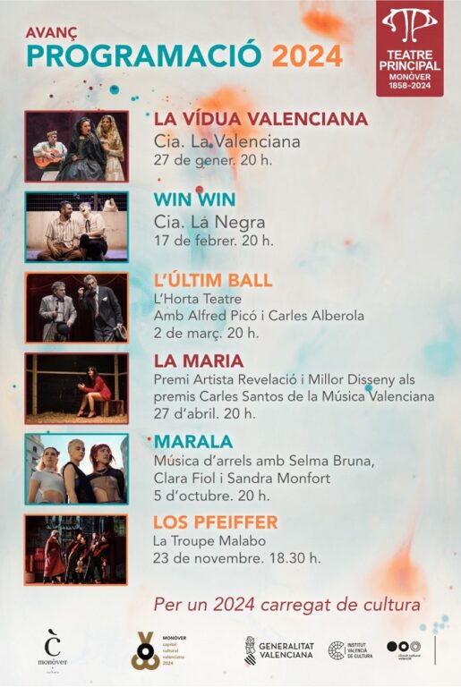 El 27 d’abril s’ha previst l’obra “La Maria”, Premi Artista Revelació i Millor Disseny als premis Carles Santos de la Música Valenciana. La música d’arrels arribarà a la ciutat amb l’espectacle “Marala”, de la mà de Selma Bruna, Clara Fiol i Sandra Monfort, el 5 d’octubre de 2024, mentre que el 23 de novembre, La Troupe Malabo presentarà als monovers i monoveres l’obra “Los Pfeiffer”.