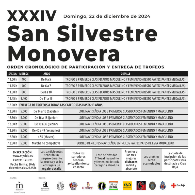 La Regidoria d’Esports, en col·laboració amb els clubs esportius de Monòver, organitza el dissabte 22 de desembre la tradicional carrera urbana pels carrers del municipi. Aquesta prova, que celebra la seua 34a edició, s’ha convertit en una de les cites esportives més esperades de la regió, amb gran acollida no només entre corredors de la província, sinó també de tota la Comunitat Valenciana i d’altres llocs d’Espanya.