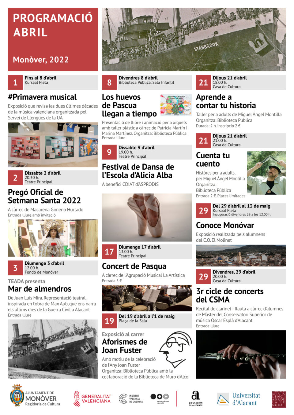 La programació va començar fa uns dies amb l’exposició #Primavera Musical, una mostra que revisa les dues últimes dècades de la música valenciana organitzada pel Servei de Llengües de la Universitat d’Alacant i que es podrà visitar el Kursaal Fleta fins al 8 d’abril. El dissabte, 2 d’abril, està previst un acte destacat dins la celebració de la Setmana Santa a Monòver. Es tracta del Pregó Oficial Solidari de Setmana Santa 2022. Correrà a càrrec de la monovera Macarena Gimeno Hurtado i l’entrada serà lliure.