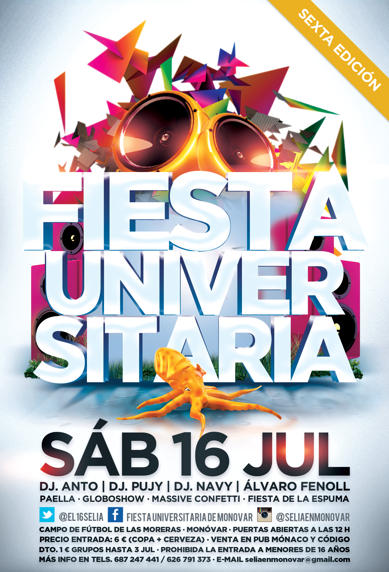 La Organización del evento ultima los detalles de la sexta edición de la Fiesta Universitaria de Monóvar. Este sábado, a las 12 horas, dará comienzo una macrofiesta en la que participarán jóvenes monoveros y de otras localidades. Se espera que más de 500 personas procedentes de toda la provincia se den cita en nuestra ciudad para divertirse en el inicio de sus vacaciones.