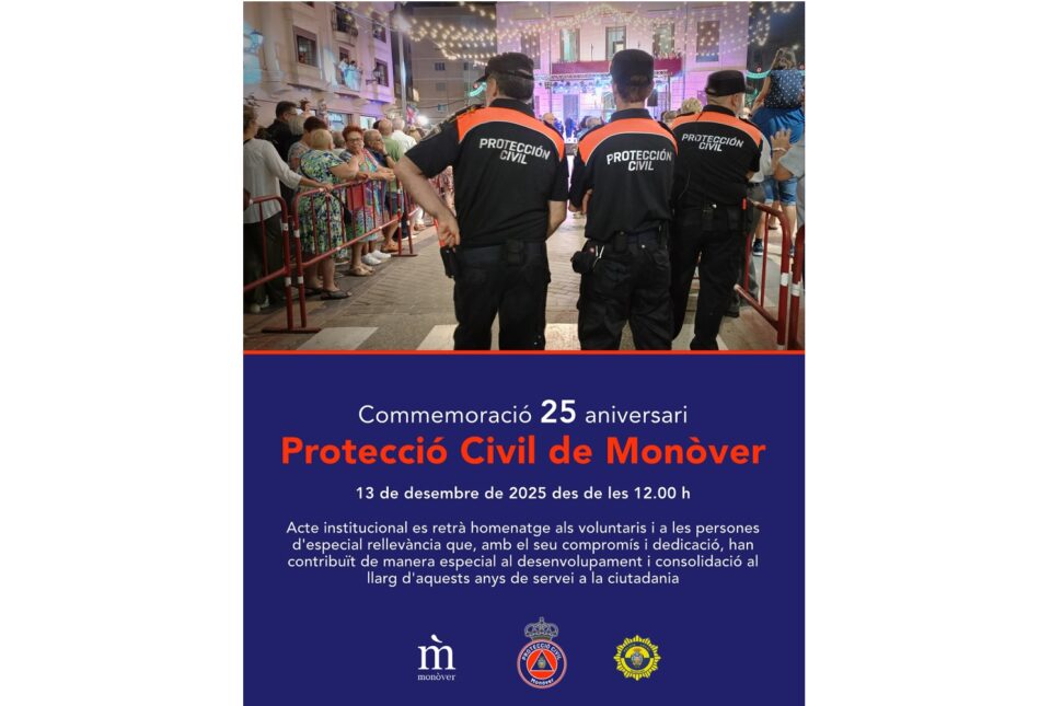 L’esdeveniment se celebrarà a les 12.00 hores al Teatre Principal de Monòver i servirà “per a commemorar un quart de segle de servei, compromís i dedicació al municipi”, com ha remarcat María Amparo Maestre, regidora de l’àrea. A més a més, comptarà amb la presència d’autoritats locals, representants de diferents entitats i cossos de seguretat, així com amb els voluntaris i voluntàries que formen o han format part de l’agrupació des de la seua creació.