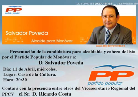 Definitivamente se han acabado las especulaciones, Salvador Poveda actual alcalde de Monóvar será el cndidato del P.P. a las elecciones de mayo del 2007. La presentación de la candidatur será el próximo día 11 de abril y a la misma asistirá el vicesecretario regional del PPCV Ricardo Costa