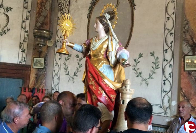 La imagen de Santa Bárbara restaurada por Mónica Navarro llegó el domingo ante la gran expectación de los monoveros