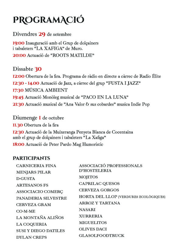 La inauguració de la Fira serà el divendres 29 de setembre a les 19.00h. Les autoritats locals i comarcals faran un passeig per la Fira acompanyats del grup de dolçainers i tabaleters La Xafigà, donant el tret d’eixida a l’encontre gastronòmic.