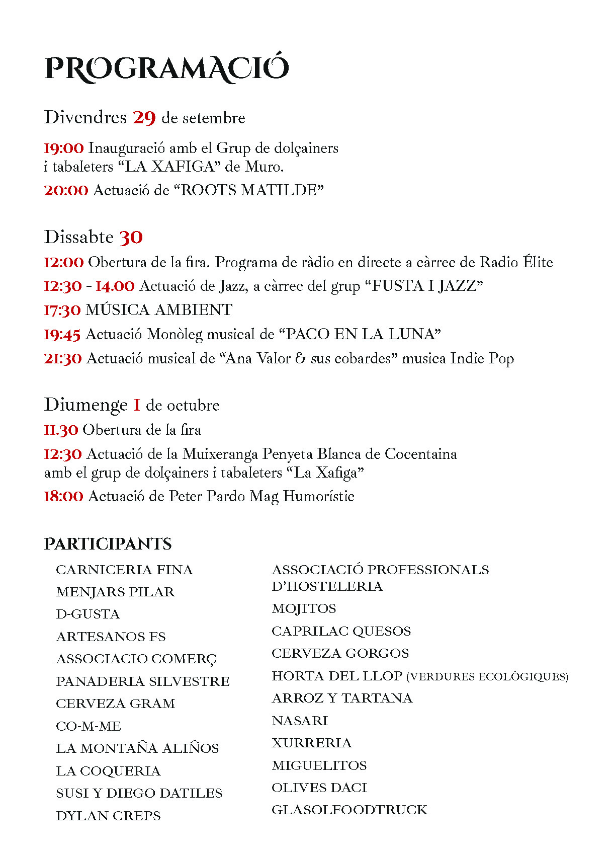 A banda de la exposició propiament comercial, hi ha programades diverses actuacions en directe tot el cap de setmana, com ara les propostes musicals de Jazz i Fusta, Ana i sus cobardes (indie pop), Roots Matilde soundsystem, l’actuació del monologuista musical, Paco en la Luna, i l’actuació del mag humorístic Peter Pardo. Destacar, també, la recuperació d’actuacions emblemàtiques com la muixeranga el diumenge de matí, que aquest anys serà a càrrec dels nostres veïns de la Muixeranga Penyeta Blanca de Cocentaina, acompanyada del grup de tabaleters i dolçainers La Xafigà de Muro.
