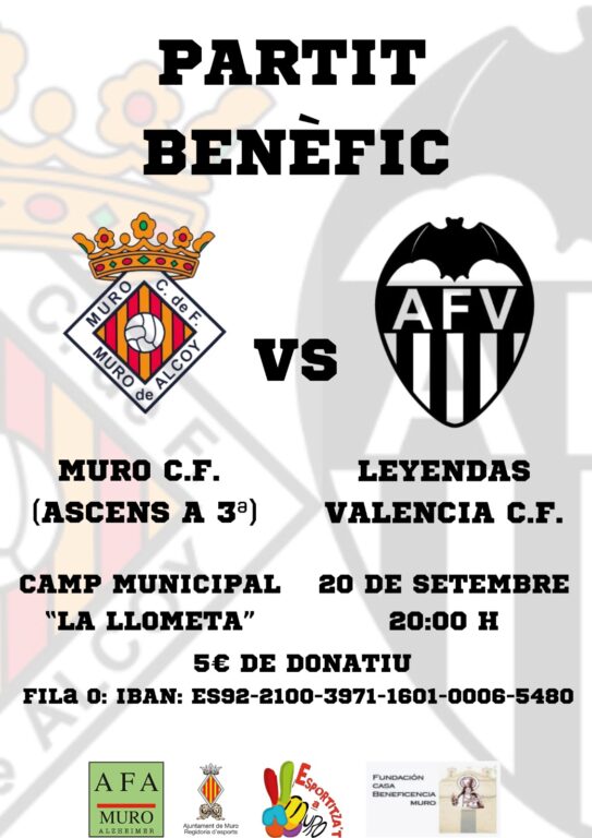 Els equips Muro CF (ascens a 3ª) i Llegendes Valencia CF disputarán un partit benèfic per recaptar fons per a dos entitats socials del municipi