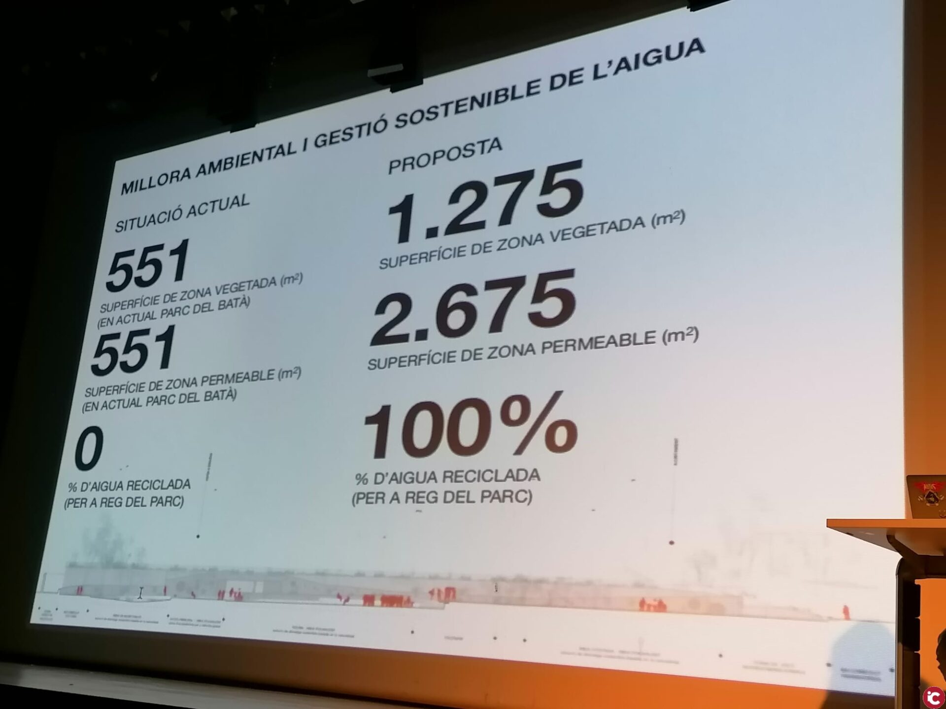 Des del vessant purament medi ambiental i d’accessibilitat, cal ressaltar que la superfície vegetada passarà de 550 metres a 1.275 ( amb una varietat de plantes i arbres autòctons) , que els paviments seran de materials preparats per poder absorbir millor l’aigua, que es passarà dels 2 accesos exteriors actuals a 5, que les barreres visuals es voran reduïdes a la mínima expressió ( actualment són 75 metres), que les línies d’accés per a serveis municipals i d’emergències tindran 17’5 metres d’amplitud ( actualment són inexistents), que l’enllumenat tindrà un caire eminentment sostenible.