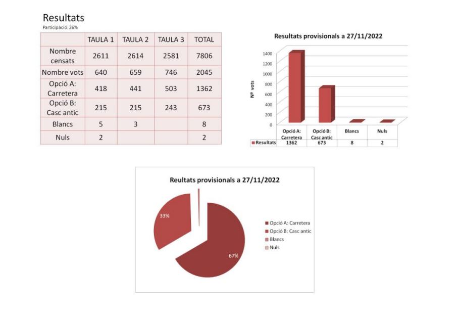 Vora un 67% dels censats (1362 vots) va optar per la carretera i el 33% pel nucli antic (673).