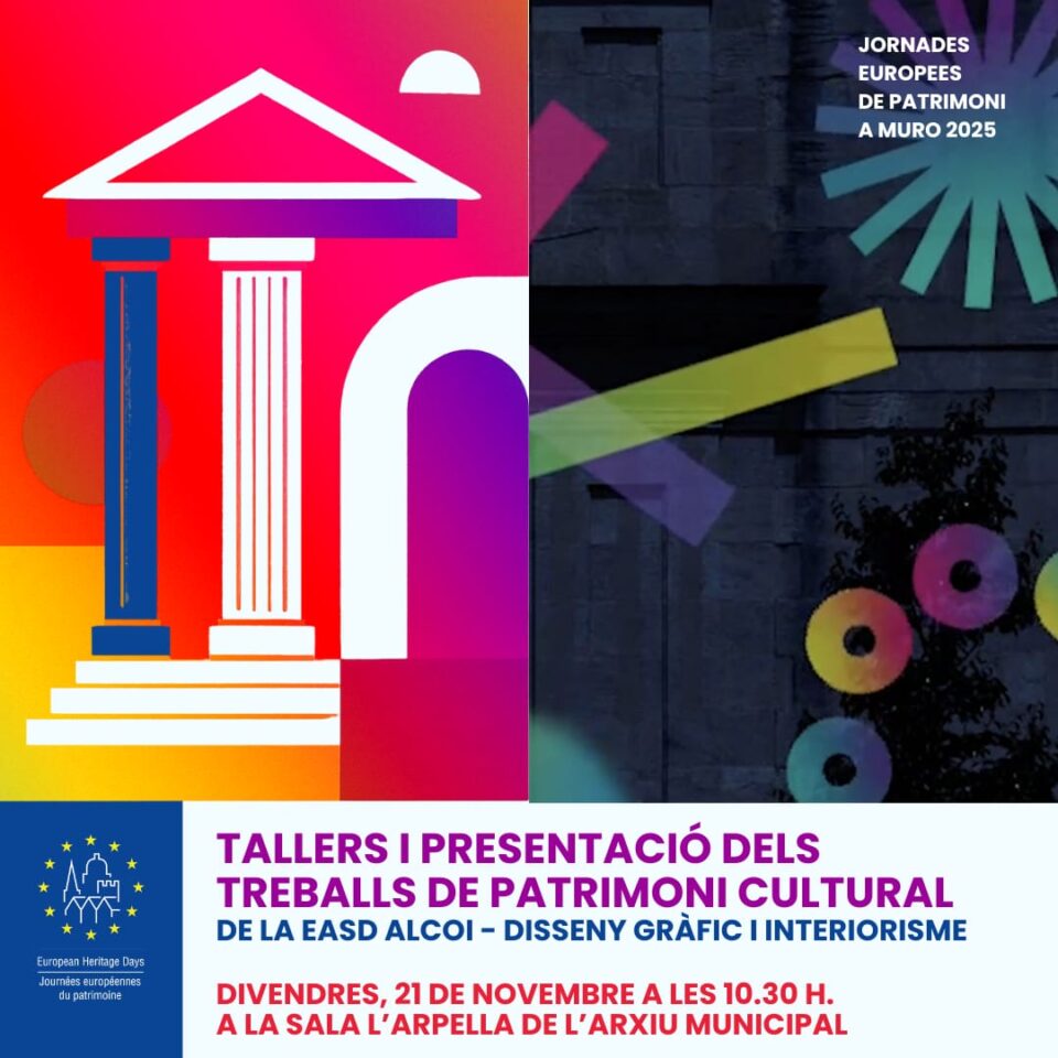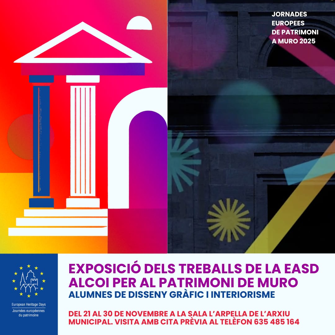 Les Jornades, que se celebren del 21 al 29 de novembre, formen part del programa europeu impulsat pel Consell d’Europa i consoliden el treball de Muro per explicar i compartir el seu patrimoni academicista i neoclàssic en clau local i comarcal. L’exposició de l’EASD Alcoi es podrà visitar fins al 30 de novembre a la Sala L’Arpella amb cita prèvia (tel. 635 485 164).