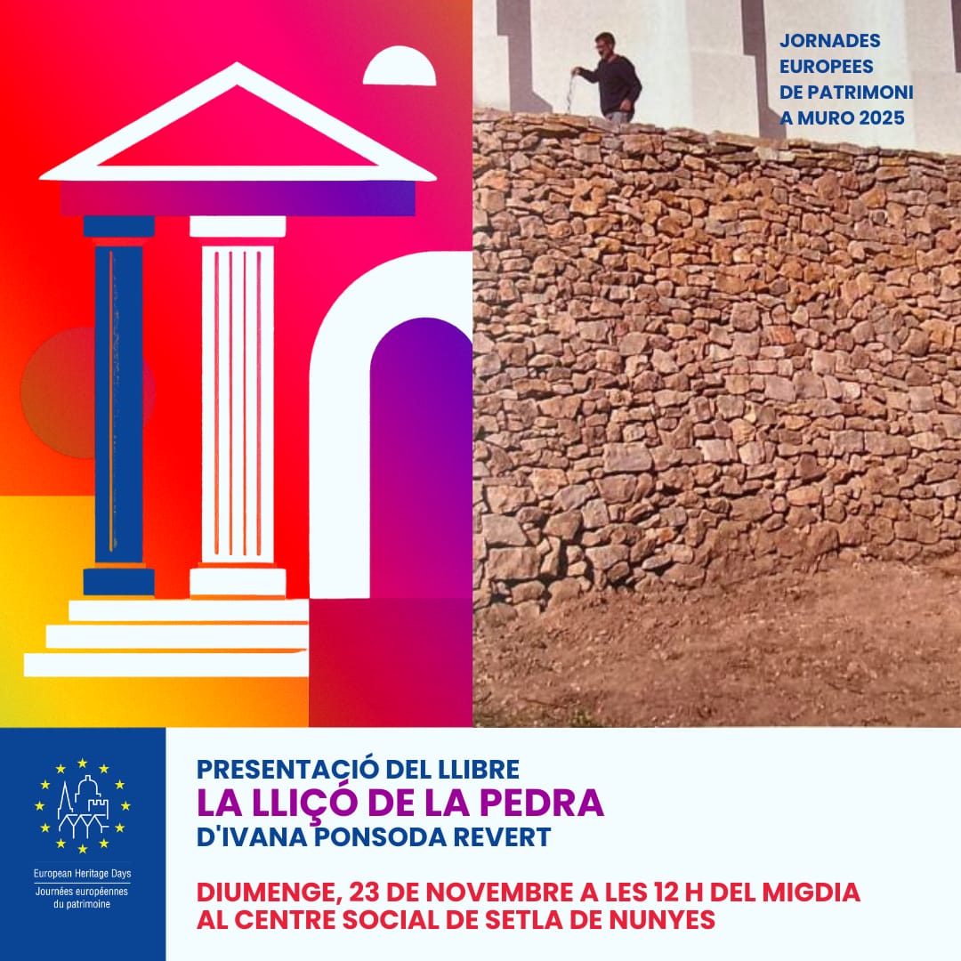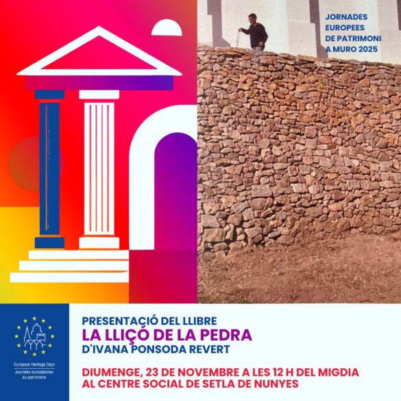 La programació continuarà diumenge 23 amb la presentació del llibre La lliçó de la pedrad’Ivana Ponsoda Revert, a les 12.00 h al Centre Social de Setla de Nunyes. La sessió se centrarà en la tècnica de la pedra en secpatrimoni cultural immaterial reconegut per la UNESCO.