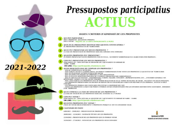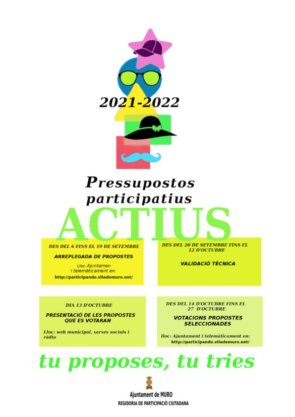Per finalitzar el procés, entre els dies 14 d’octubre i 27 del mateix mes, s’aplegarà a l’última fase d’aquestos Pressupostos Participatius » ACTIUS», procedint a votar per part de totes les persones interessades empadronades a Muro i amb un mínim de 14 anys complits.