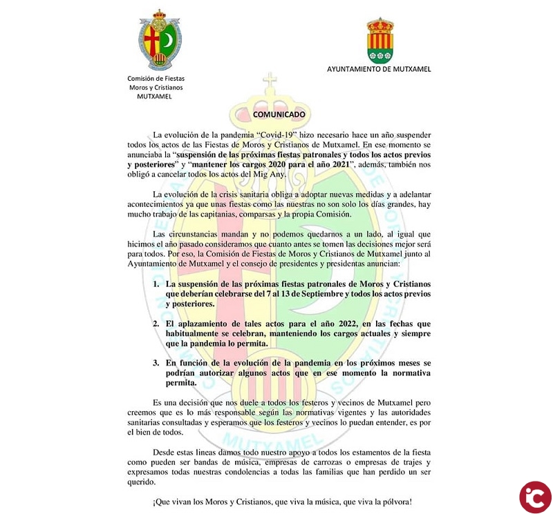 El Ayuntamiento de Mutxamel y la Comisión de Fiestas de Moros y Cristianos han decidido suspender las fiestas de Moros y Cristianos del 2021, que se iban a celebrar los días 7 a 12 de septiembre por motivo de la pandemia que actualmente seguimos viviendo. A pesar de que la situación es mucho mejor que el año pasado, por los menores contagios y el proceso de vacunación, ambas entidades son conscientes de la dificultad de realizar unas fiestas, tal y como se conocen en realidad. A esta decisión se ha unido la Comisión de Fiestas de El Ravalet, cuyas fiestas del 6 y 8 de septiembre también quedan suspendidas.