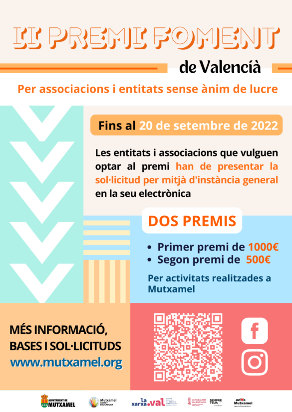 Aprovada la convocatòria del Premi Foment del Valencià Ajuntament de Mutxamel, amb un premi de 1.000 € i un altre de 500€, té l’objectiu de promoure  l’ús del valencià entre associacions del municipi sense finalitat lucrativa.