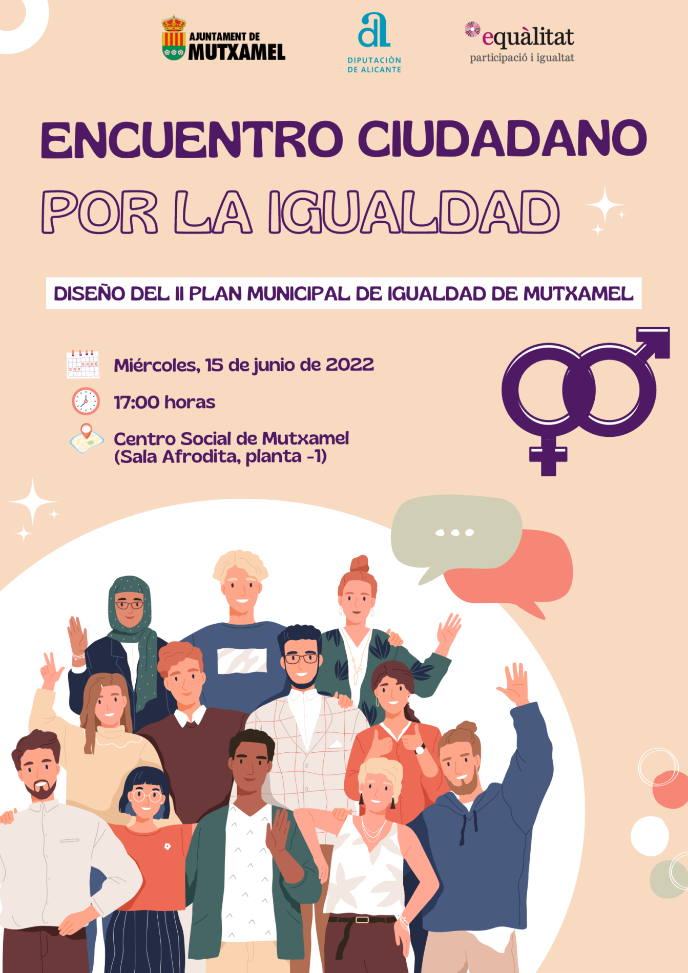Desde el Ayuntamiento de Mutxamel se hace un llamamiento a la participación activa en el Encuentro Ciudadano por la Igualdad, pues contar con la voz de la ciudadanía puede garantizar la consecución de la igualdad real y efectiva en Mutxamel y, con ella, el bienestar de todas las personas que lo habitan.