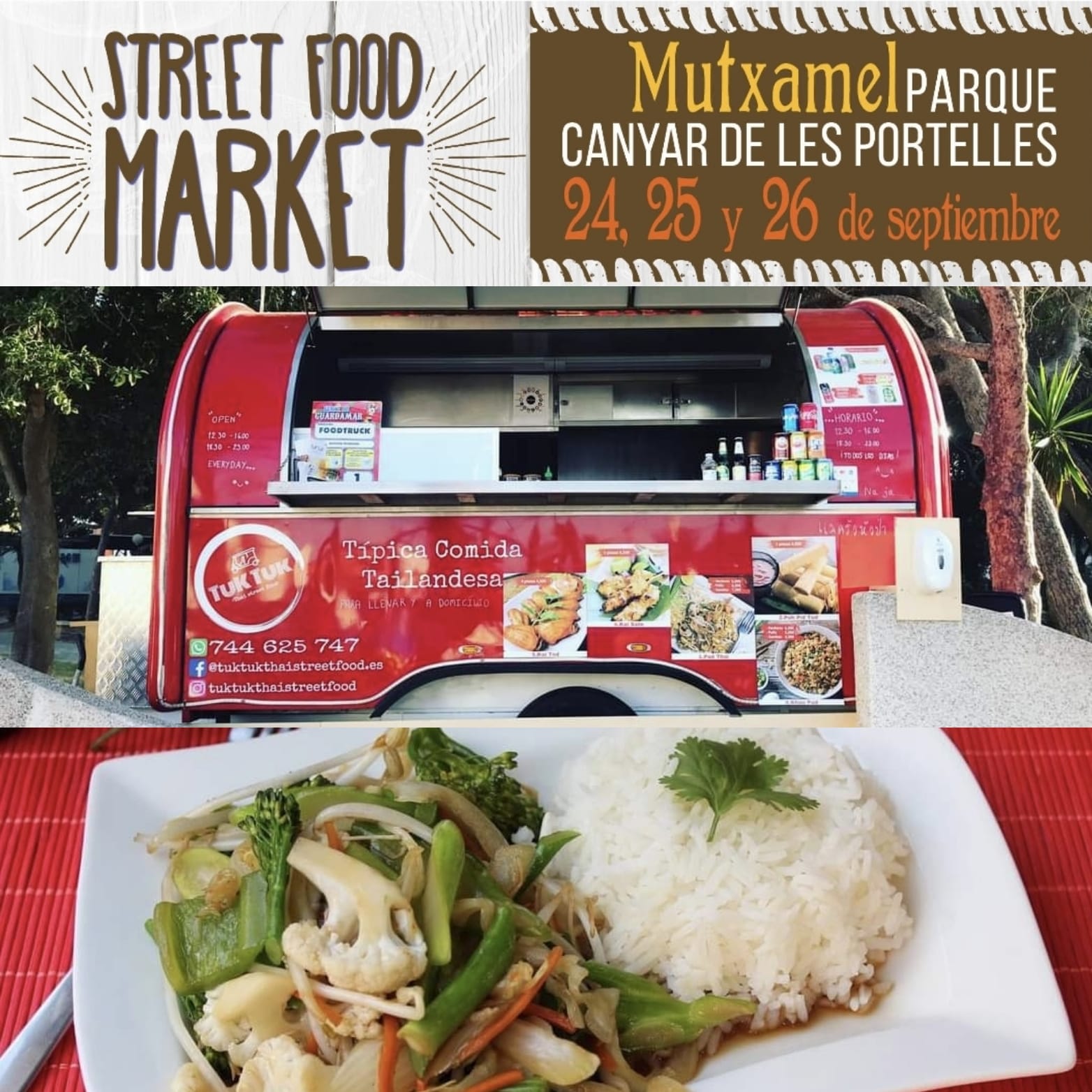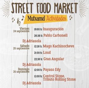 Desde La Concejalía de Turismo, representada por Inmaculada Pérez , apuesta por la quinta edición del Street Food Market en el Parque Canyar de les Portelles de Mutxamel que tendrá lugar desde el próximo viernes 24 de septiembre a las 18:00 h hasta el domingo 26 de septiembre a las 23:00 h.