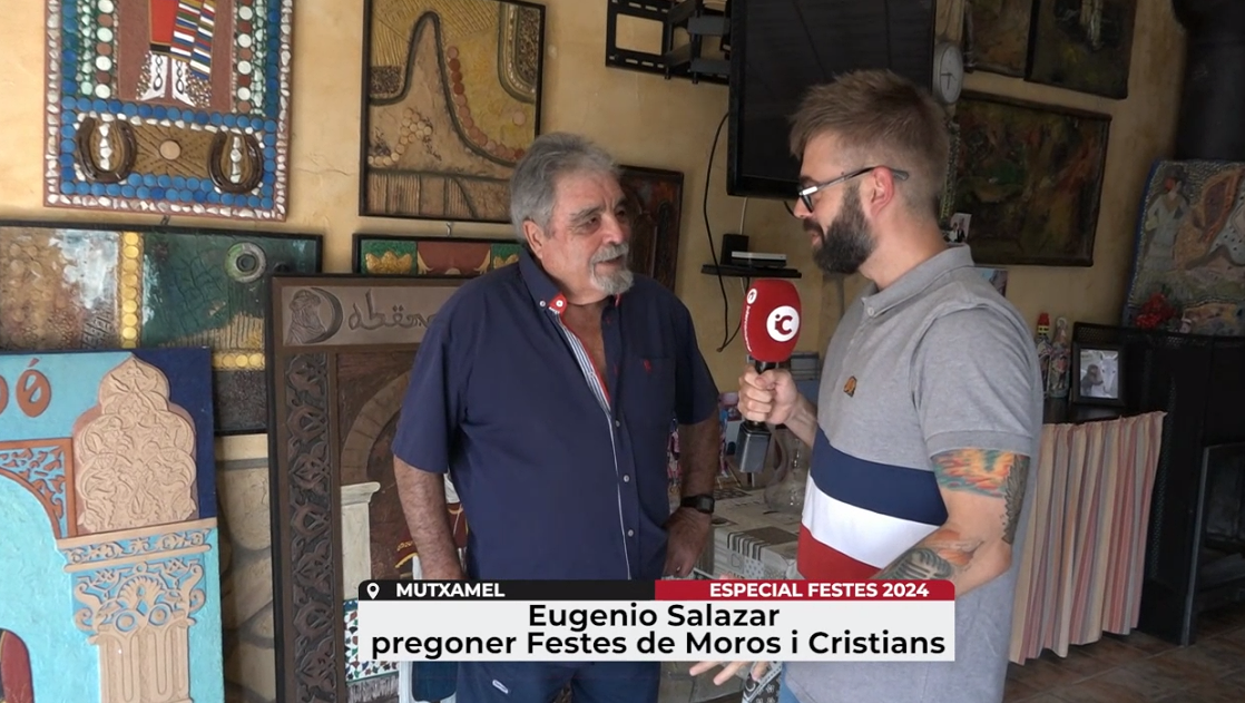 En les nostres entrevistes prèvies a les festes de Moros i Cristians de Mutxamel, hem entrevistat Eugenio Salazar, pregoner 2024. Estucador i artista, hem visitat el seu taller, on ens ha mostrat alguna de les seues obres. Les festes son protagonistes, com hem pogut veure, de gran part dels seus quadres.