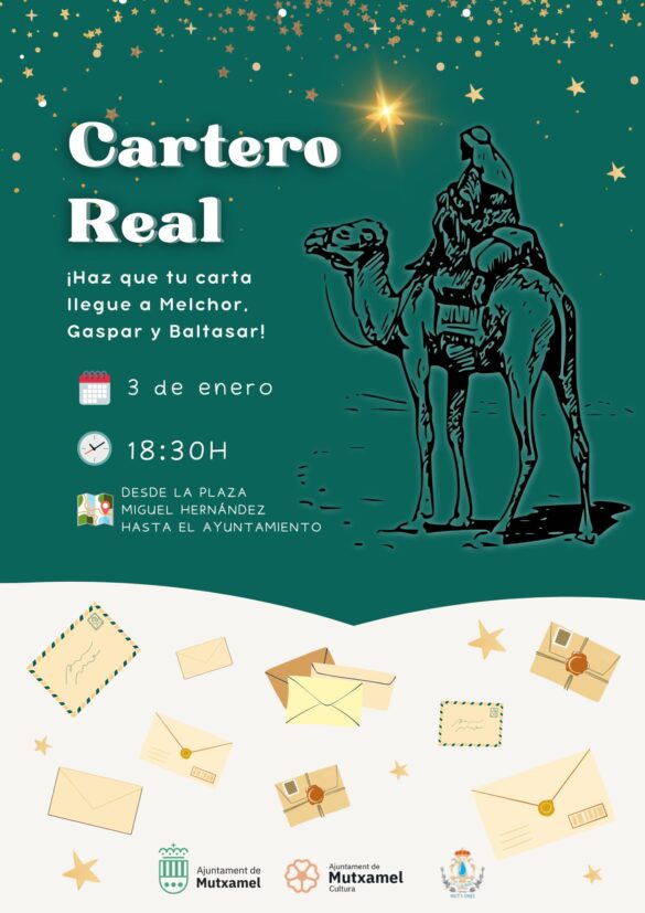 L’emissari dels RRMM d’Orient, el Carter Real; arribarà al municipi el pròxim 3 de gener a les 18:30h i recorrerà els carrers més cèntrics en un esdeveniment únic ple d’il·lusió i emoció per a tota la família. Al seu pas arreplegarà les cartes de tota la ciutadania de Mutxamel, per a fer arribar als Reis Mags tots els desitjos