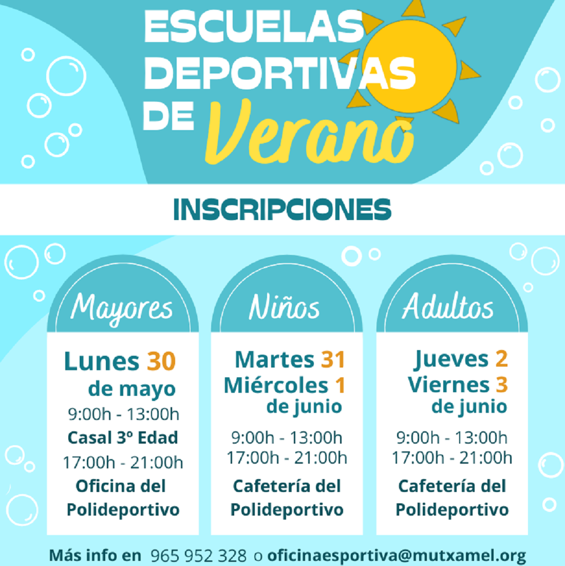 El próximo 4 de julio se pondrán en marchan las Escuelas Deportivas de Verano 2022 de Mutxamel. A partir de esa fecha, la Concejalía de Deportes ha programado una gran variedad de servicios y actividades deportivas, dirigidas tanto a mayores, como a adultos, o a niños y niñas. Para poder participar en estas actividades se necesitas realizar la inscripción, programada para la próxima semana en distintas dependencias municipales.