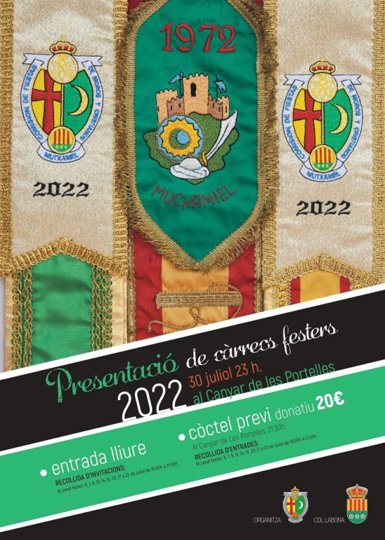 El próximo 30 de Julio, en el parque el Canyar de les Portelles, serán presentadas las nuevas capitanías, en el bando moro por Xodios y en el bando cristiano Maseros.