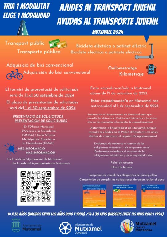 Mutxamel obri el termini per a sol·licitar les ajudes al transport juvenil “Bono Jove 2024” dirigides a joves entre 14 i 30 anys. La iniciativa pretén fomentar l’ús del transport sostenible i públic en quatre modalitats, dues per a adquirir bicicletes o patinets elèctrics o bicicletes convencionals, i altres dues per a sufragar el desplaçament al centre educatiu de manera personal o en transport públic, sufragant així les targetes do Bono Bus Jove o Escolar.